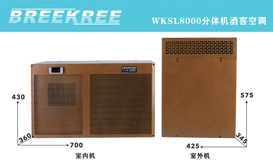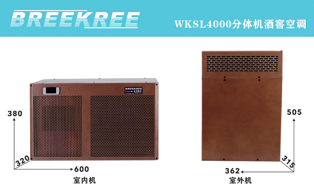 比士凱爾[BREEKREE]壁掛(guà)式酒窖恒溫恒濕空調,室內機嵌入於酒架中,外觀美觀,體積小,室外(wài)機采用不超(chāo)過15M的銅管連接,可滿足1-60個立方的酒窖空間進行恒溫恒濕,其它WKSL4000適用於1-30立方米酒窖空間使用,WKSL8000適用於30-60立方米酒窖空間使用,