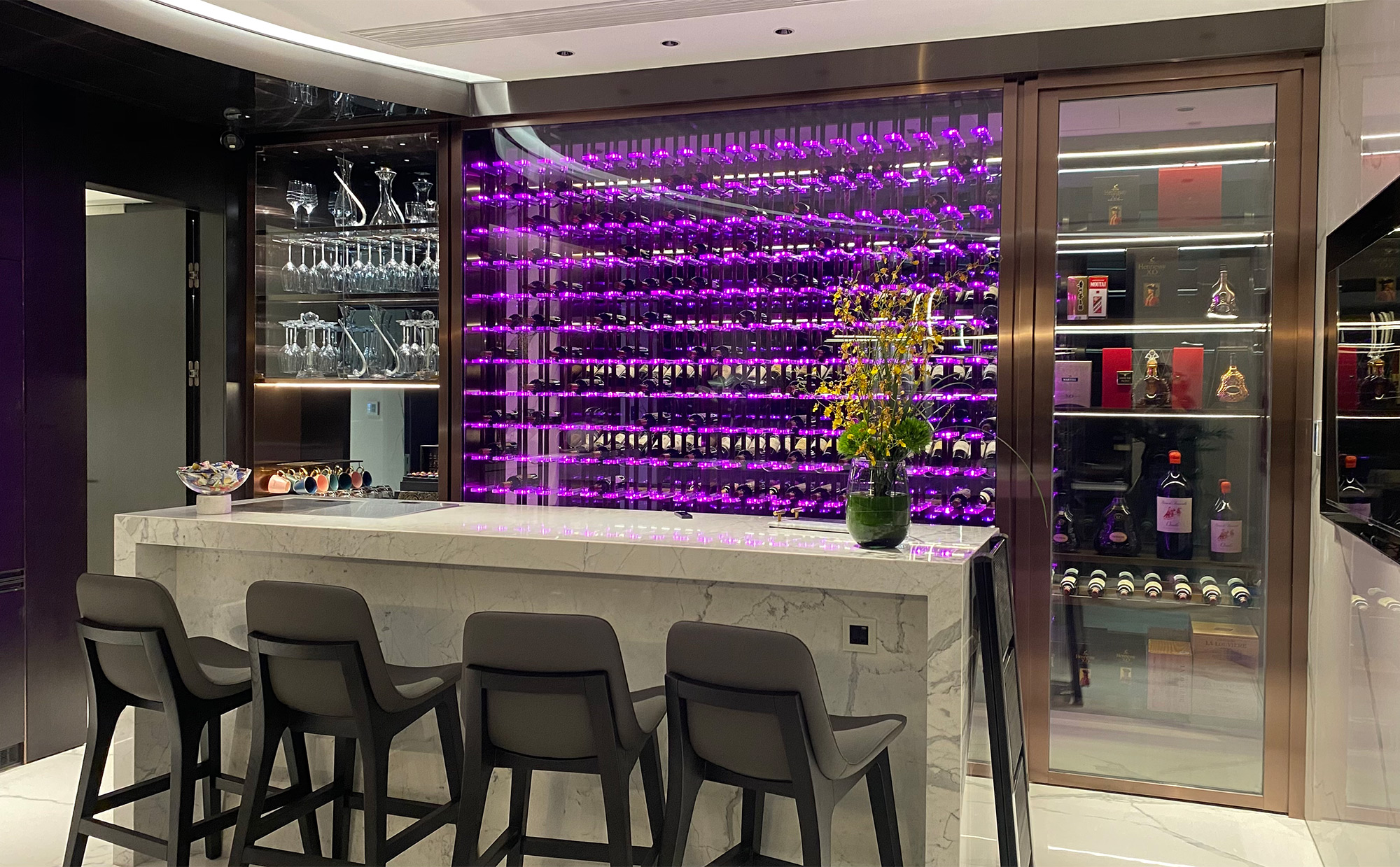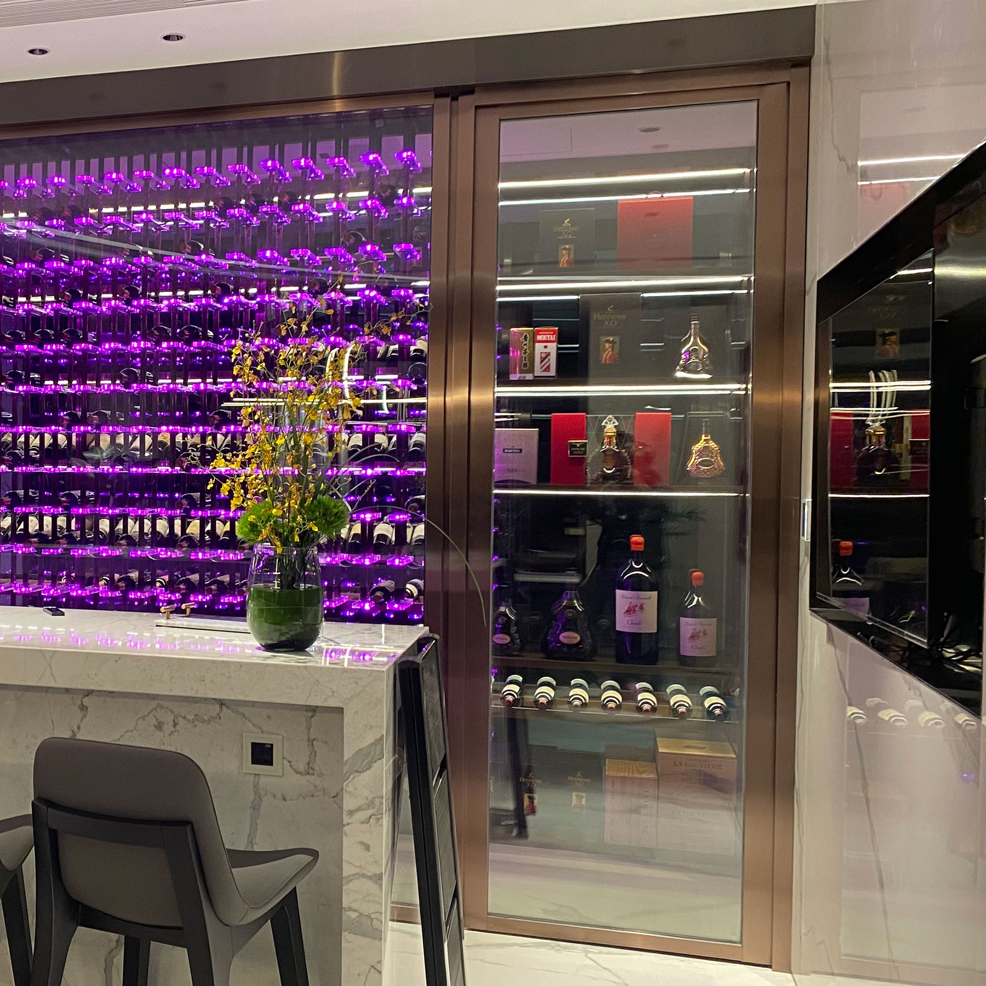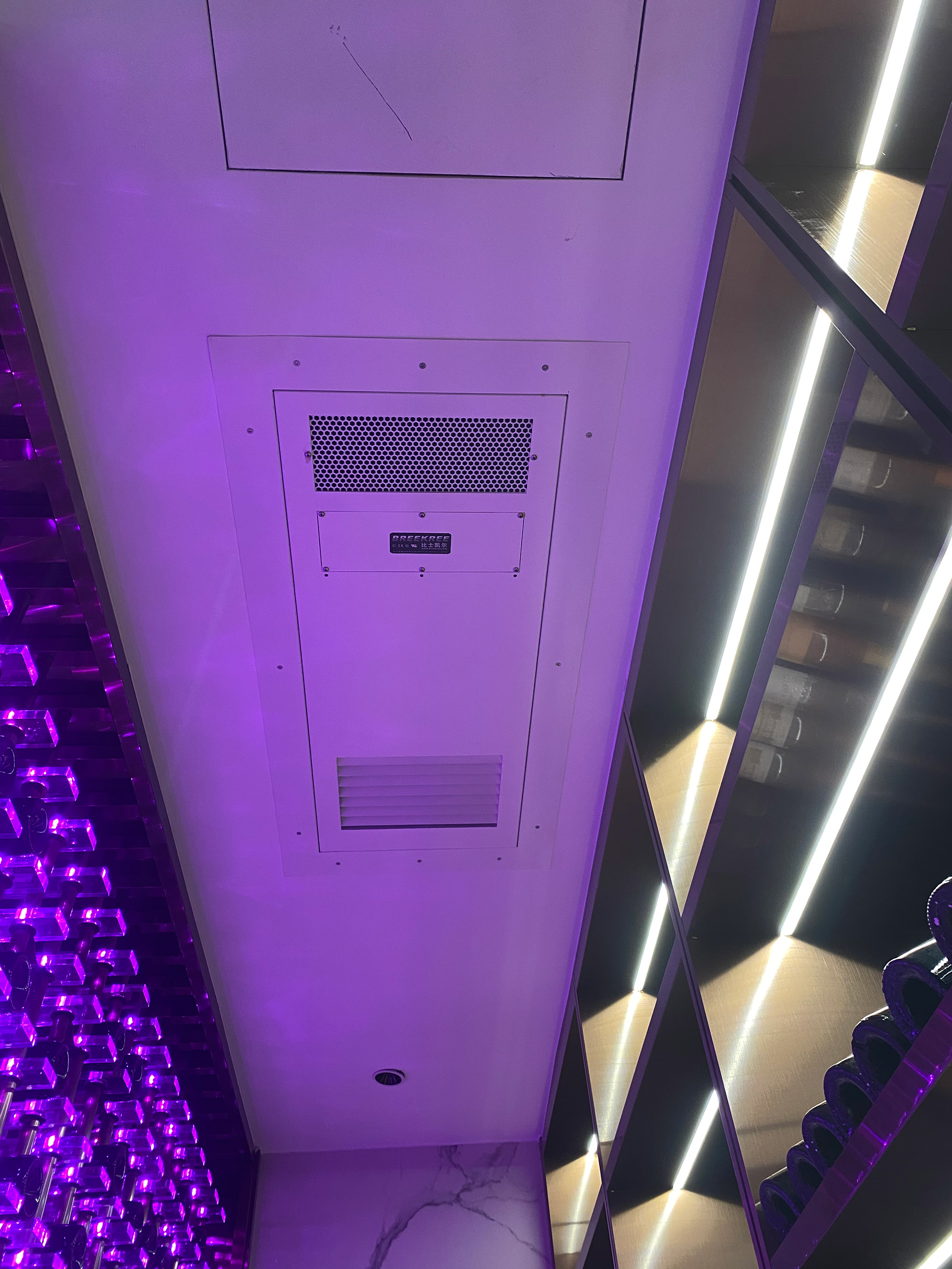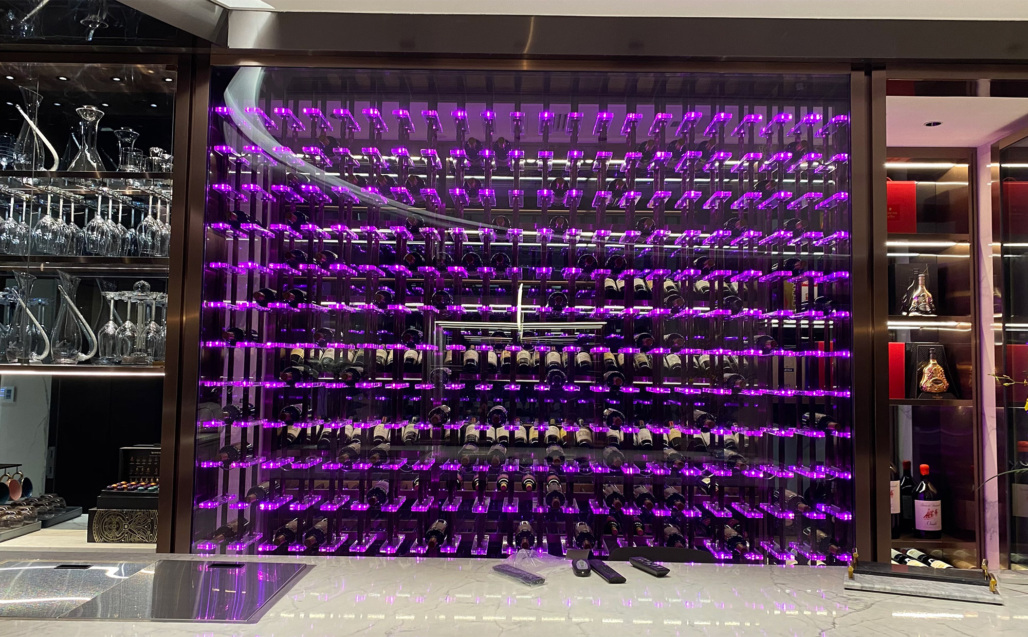 炫酷(kù)不(bú)鏽鋼(gāng)亞克力藝術酒窖圖片 該項目位於福建泉州(zhōu),得(dé)益於客戶對酒(jiǔ)窖的專業認可,由比(bǐ)士亞酒窖設計公司整體設計製作,不鏽鋼酒櫃采用國(guó)標不鏽鋼304,酒架用亞克力,配BRG燈帶,比士凱(kǎi)爾(ěr)[BREEKREE]酒窖空調,溫度控製為13-16度