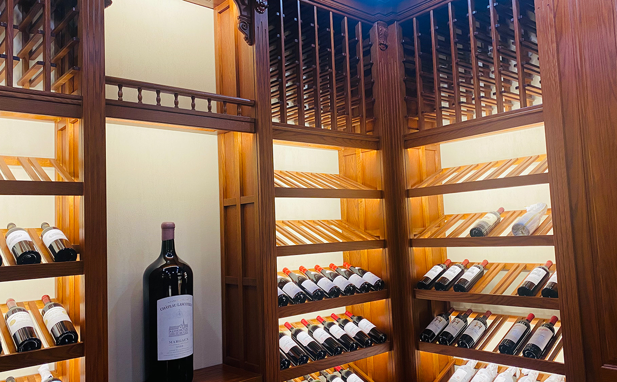 上海九間堂私人別墅酒(jiǔ)窖空調設計與安裝調試項(xiàng)目中的:美國紅橡木實木(mù)酒架