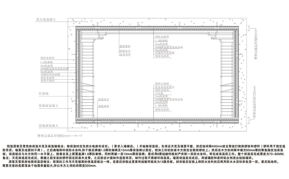 酒窖的建造(zào)過程中保(bǎo)溫層及保溫門的製作要求 一,保溫層製(zhì)作方法及要求: 酒窖的建造與雪茄房保溫層天花及保溫牆做法:做保溫時應先把水電路布(bù)設(shè)完。(要求入牆鋪(pù)設。)開始做保溫(wēn)層,先保證天花及牆(qiáng)麵平整,然後按間隔400mm放龍骨線(xiàn)打膨脹鑼栓和鑼杆(gǎn)(鑼杆用於固定造型(xíng)吊頂,牆麵及地麵則不用),之後滿牆刷環保防水(shuǐ)塗料,待幹燥後滿鋪1.0厚防潮棉及10mm厚保溫棉以固定,把加工好(hǎo)的防腐木(mù)方固定在膨(péng)脹鑼栓上;然後在(zài)木方的間隔中(zhōng)填充50mm厚的聚氨酯發泡保溫板,保溫板應與木(mù)方(fāng)持同一水平麵上,接著在(zài)其上麵覆蓋滿1.0厚防潮棉,同時再鋪一層10mm厚保溫棉(mián);最後用(yòng)9厚矽酸鈣板封嚴並(bìng)刷一層防水塗料,即完成保溫層工作。整個保溫層完成厚度為(wéi)70-80MM.備注:天花保溫層完成後,根據之(zhī)前安裝的鑼杆固定防腐(fǔ)木龍骨,之後按設計圖製(zhì)作造型吊頂(dǐng),製作過程不(bú)得破壞保溫層。牆麵保溫層完成後,用玻璃膠和瓷磚粘(zhān)合劑混合粘貼牆磚。酒窖的建造與雪茄房(fáng)地麵保溫層做法(fǎ):前麵的工作與天花牆麵的保溫層做法一樣,在最後封板這裏要將矽酸(suān)鈣板改為15厘夾板,封完板後在(zài)板上刷防水塗料然後再用防水水(shuǐ)泥砂漿批蕩(dàng)一層,最後貼地磚。需要注意的是蒙混由於地麵承重較大,所以木方之間的間隔變(biàn)300mm.