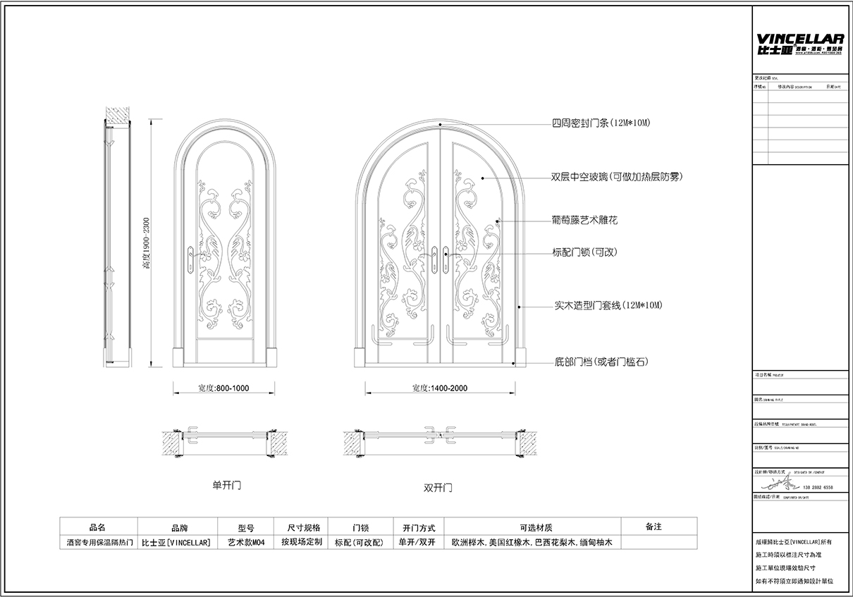 藝術係列實木雕花酒窖門(mén)尺寸設計(jì)與做法(fǎ) 藝(yì)術係列實木雕花酒窖專用保溫隔熱門,采用按現場定製模式,門可(kě)分為單開門(單開門尺寸:寬度為:800mm-1000mm,高度為(wéi):1900mm-2300mm)與(yǔ)雙開門(mén)(雙開門(mén)尺寸:寬度為:1400mm-2000mm,高度為(wéi):1900mm-2300mm),門頁以全實木雕花藝術結構,分別以:歐洲櫸(jǔ)木,美國紅橡木,巴西花(huā)梨木,緬甸柚木四種材質做為外框及門框做法