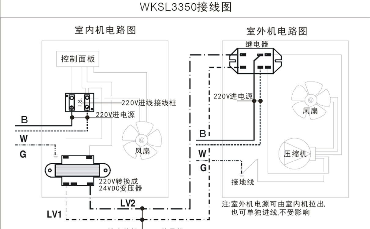 說明:室內機與室外機的電源線可(kě)以同(tóng)是(shì)由(yóu)室內引出,室外機也可以單獨(dú)接電源,室外機是由室內機信號進行控製的。
