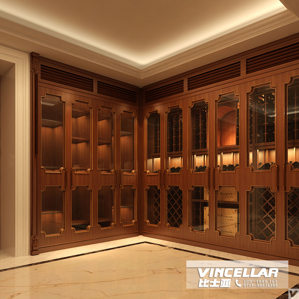 項目位於廣州(zhōu)恒大(dà)禦(yù)景半島花園別墅,簡約歐式風格,外框用美國紅橡木實木著色處理,內部酒架美國紅橡木實木原色,不做任何油漆,定(dìng)製恒溫恒濕類,比士凱爾[BREEKREE]酒櫃專用製冷係統(tǒng),溫度(dù)控製在7-18度,濕(shī)度65%